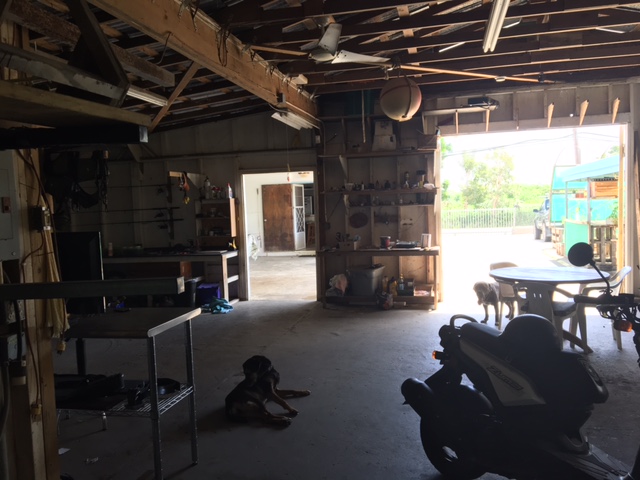 One bedroom/ 1 bath all concrete home with huge paved driveway and off street area, plus a huge covered rear terrace flows into a “barn” shop/garage big enough for 8 cars!